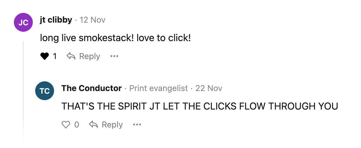 Shoutout to JT Clibby for their comment on our last Smokestack by the way. Hell yeah. We love to click around here. Smokestack is all about clicking—we hope to gather you a few good pieces of Internet Content per month that we find on our endless digital hunt for non-poisonous berries to share with the tribe.